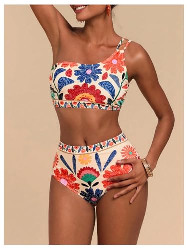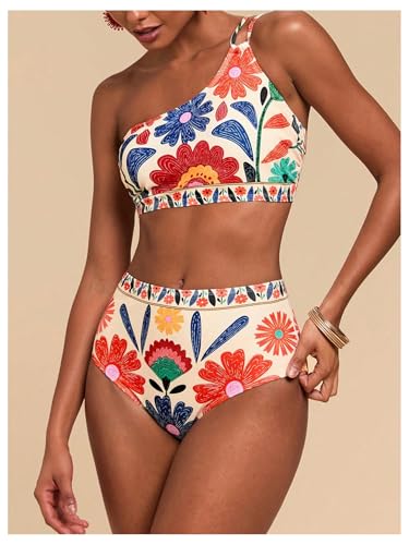 MakeMeChic Women's High Waisted Bikini Set Floral One Shoulder Boho Swimwear Bathing Suit Swimsuit 1