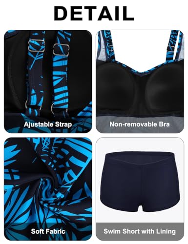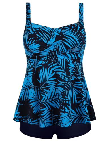 HOT ! Septangle Bathing Suit for Women with Shorts High Waisted 2 Piece Tankini Swimsuits Ruched Twist Front 2025 Womens Swim Suits, Blue & Leaves US10
