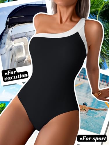 HOT ! One Shoulder Color-Block Swimsuit, Modest Full-Coverage, Vacation Pool Party