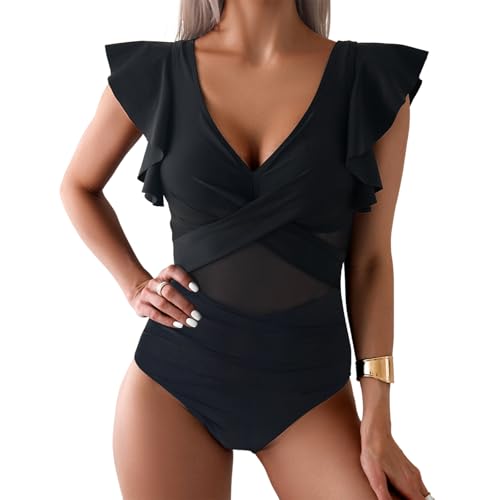 HOT ! Women's One-Piece Swimsuit Tummy Control High Waisted Ruffled Sleeves V-Neck Mesh Bathing Suit for Beach