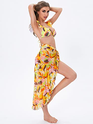 WDIRARA Women's Floral Boho Triangle Ruffle Trim 3 Piece Swimsuits with Sarong Skirt 6