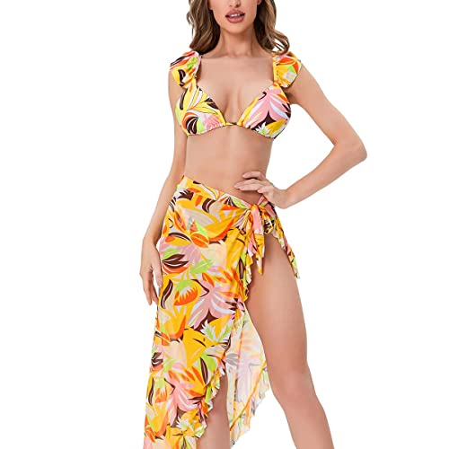 WDIRARA Women's Floral Boho Triangle Ruffle Trim 3 Piece Swimsuits with Sarong Skirt 1