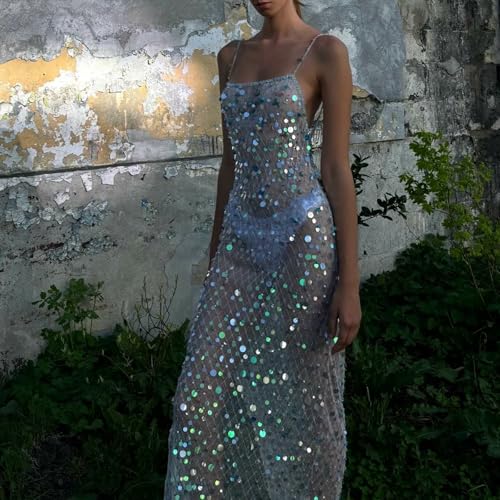 • Size: S, M, L, please check our product details in the description. Women Sexy Spaghetti Straps Maxi Bodycon Sequined Dress Sleeveless Shiny Sparkly Glitter Beach Bikini Swimsuit Cover Ups