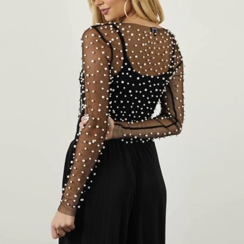 • Stylish and Versatile Pearl Mesh Sheer Top This LOUSEA pearl top features an alluring sheer mesh design. adorned with endless rows of beautiful pearls. The long sleeve and round neck add a touch of elegance to any outfit. Whether you wear it as a cover up for a night out or a formal