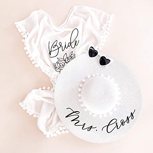 • Each white cover up comes printed with a black floral silhouette and "Bride" in a pretty script. The print is one-sided. You can choose to wear it on the front or back.