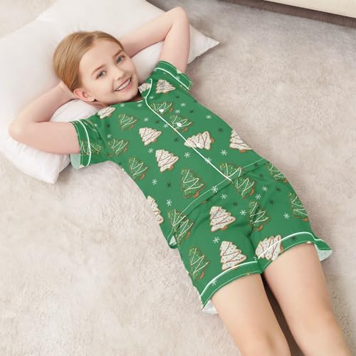 Satin Pajama Sets Short Sleeve Christmas Tree Cookies on Green Button Down Silky Nightwear 2 Piece PJS 5-14Y 1