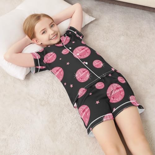 Satin Pajama Sets Short Sleeve Pink Disco Balls Pattern Button Down Silky Nightwear 2 Piece PJS 5-14Y 1