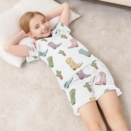 Satin Pajama Sets Short Sleeve Cowboy Boots and Cacti Button Down Silky Nightwear 2 Piece PJS 5-14Y 6