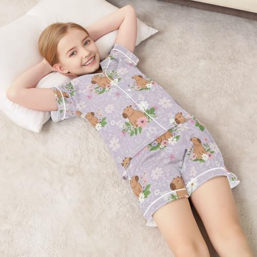 Satin Pajama Sets Short Sleeve Cute Animals Among Flowers Button Down Silky Nightwear 2 Piece PJS 5-14Y 6