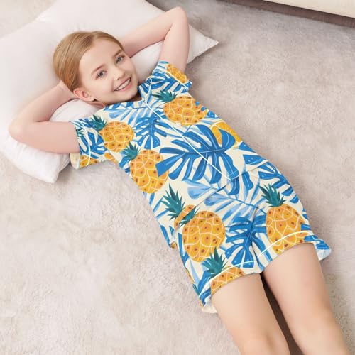 ALAZA Blue Palm Leaf Pineapple Pajamas Satin Pajama Set Short Sleeve Button Down Sleepwear 1