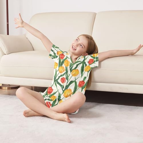 ALAZA Red Yellow Tulip Blossom Pajamas Satin Pajama Set Short Sleeve Button Down Sleepwear 4