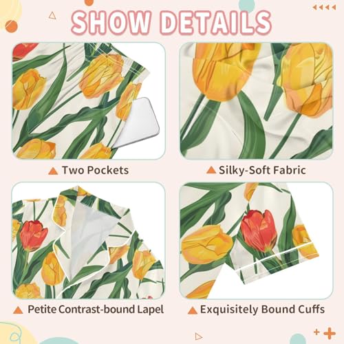 ALAZA Red Yellow Tulip Blossom Pajamas Satin Pajama Set Short Sleeve Button Down Sleepwear 6