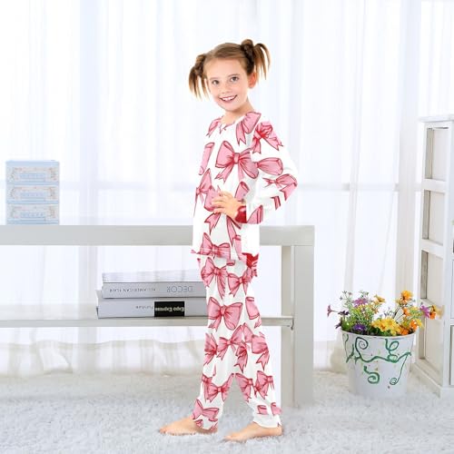 Pink Bows on White Soft Pajama Set for All Seasons,Breathable Pjs Long Sleeve Sleepwear,Comfy Loungewear 2 Piece Underwear Set 3T 7