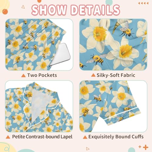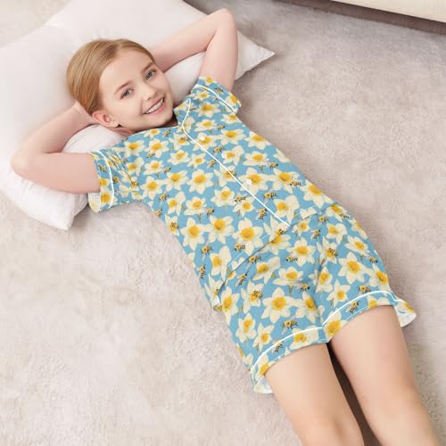 Flower Yellow Bee Pajamas Sets Short Sleeve Silk Stain Pjs Button Down Sleepwear for 5-14Y 5