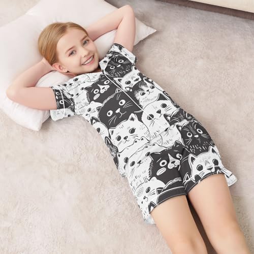 HOT ! ALAZA Black White Cat Animal Kitten Pajamas Satin Pajama Set Short Sleeve Button Down Sleepwear