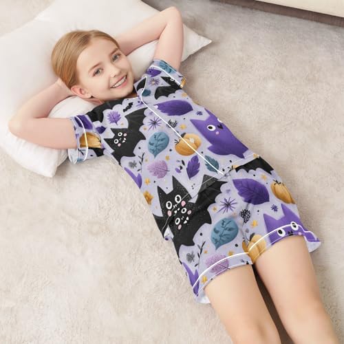 Satin Pajama Sets Short Sleeve Halloween Themed Bat Pattern Design Button Down Silky Nightwear 2 Piece PJS 5-14Y 5