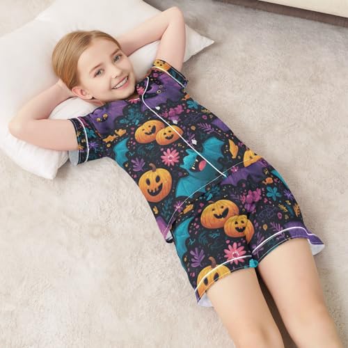 Satin Pajama Sets Short Sleeve Halloween Bats Pumpkins Button Down Silky Nightwear 2 Piece PJS 5-14Y 7