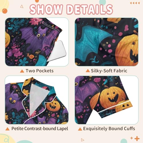 Satin Pajama Sets Short Sleeve Halloween Bats Pumpkins Button Down Silky Nightwear 2 Piece PJS 5-14Y 6
