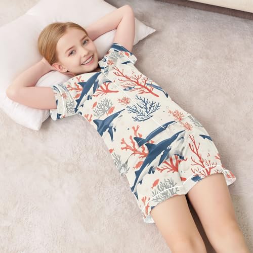 HOT ! ALAZA Shark Coral Reef Vintage Pajamas Satin Pajama Set Short Sleeve Button Down Sleepwear