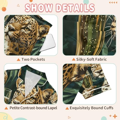 Satin Pajama Sets Short Sleeve Leopard Holding Glass Wine Button Down Silky Nightwear 2 Piece PJS 5-14Y 7