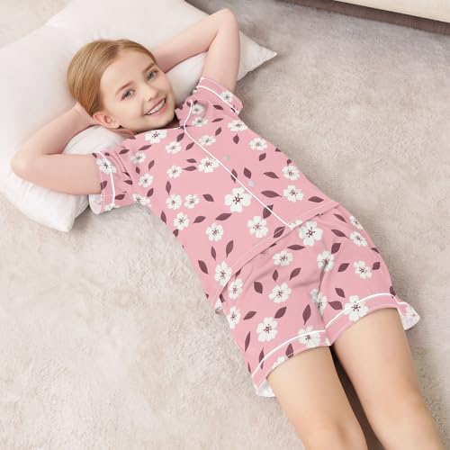 HOT ! Pink Blossom Pattern Summer Satin Pajama Set, Cute Button-Down Sleepwear Pj Set for Sleep Wears