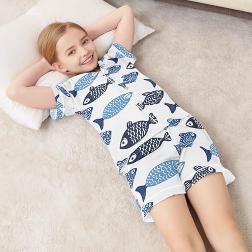 Satin Pajama Sets Short Sleeve Blue Fish Pattern Print Button Down Silky Nightwear 2 Piece PJS 5-14Y 6