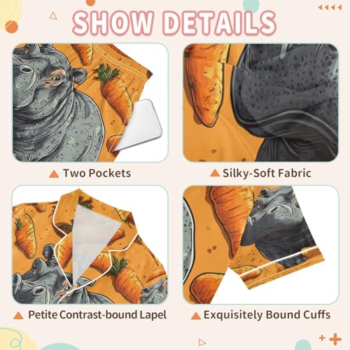 Satin Pajama Sets Short Sleeve Hippo Among Many Carrots Button Down Silky Nightwear 2 Piece PJS 5-14Y 6