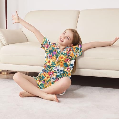 ALAZA Tropical Flower Sugar Skull Blossom Pajamas Satin Pajama Set Short Sleeve Button Down Sleepwear 3