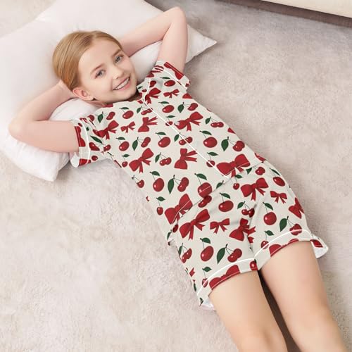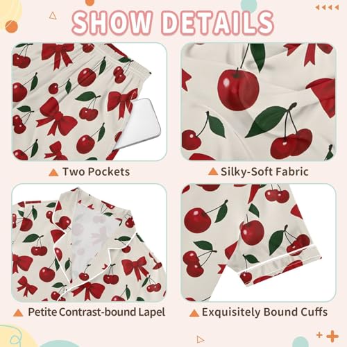 ALAZA Cherry Bow Leaf Retro Satin Pajamas Set Short Sleeve Button Down Sleepwear Summer Pjs 2 Piece 1
