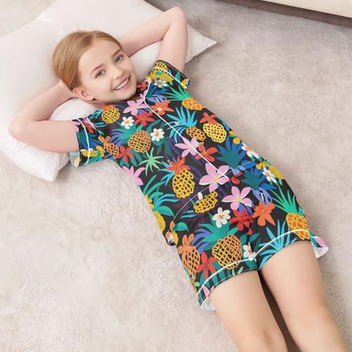 ALAZA Pineapple Blossom Leaf Flower Satin Pajamas Set Short Sleeve Button Down Sleepwear Summer Pjs 2 Piece 1