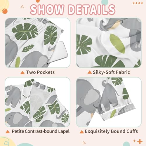 ALAZA Elephant Palm Leaf White Pajamas Satin Pajama Set Short Sleeve Button Down Sleepwear 4