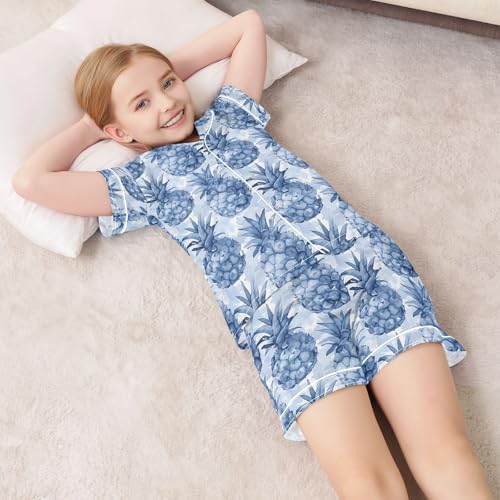HOT ! ALAZA Blue Watercolor Pineapple Satin Pajamas Set Short Sleeve Button Down Sleepwear Summer Pjs 2 Piece