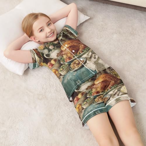 Satin Pajama Sets Short Sleeve Thanksgiving Feast with Turkey Button Down Silky Nightwear 2 Piece PJS 5-14Y 7