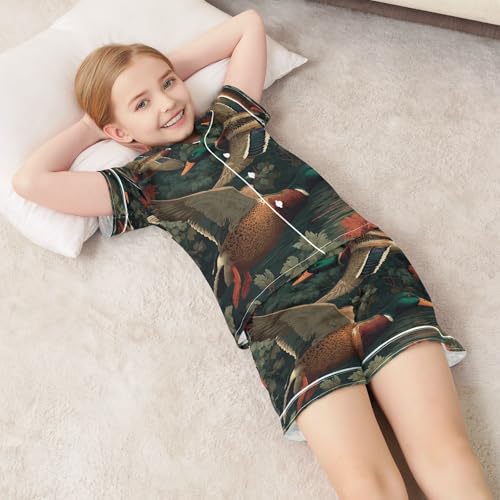 Satin Pajama Sets Short Sleeve Flying Ducks Fall Leaves Button Down Silky Nightwear 2 Piece PJS 5-14Y 7