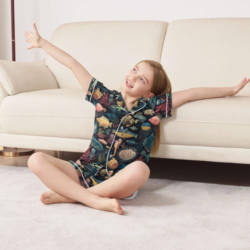 ALAZA Fish Coral Reef Seahorse Satin Pajamas Set Short Sleeve Button Down Sleepwear Summer Pjs 2 Piece 1