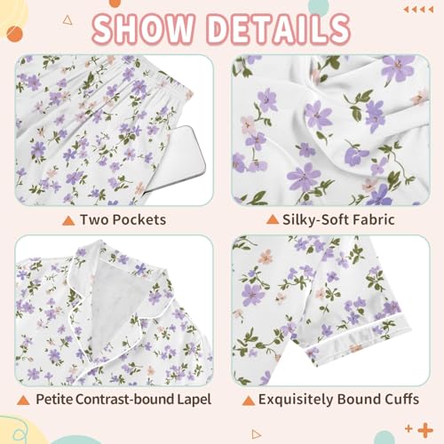 Small Purple Floral Summer Satin Pajama Set, Cute Button-Down Sleepwear Pj Set for Sleep Wears 5