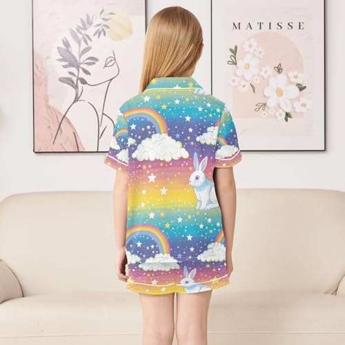 senya Rabbit Rainbow Cloud Satin Summer Pajama Sets Silk Short Sleeve Button Down Sleepwear 1