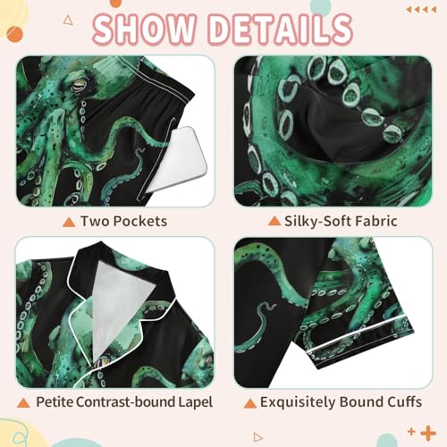 ALAZA Watercolor Green Octopus Black Satin Pajamas Set Short Sleeve Button Down Sleepwear Summer Pjs 2 Piece 6