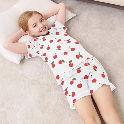 ALAZA Red Cherry Leaf White Satin Pajamas Set Short Sleeve Button Down Sleepwear Summer Pjs 2 Piece 1