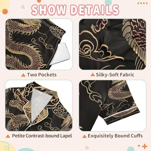 ALAZA Happy Chinese Dragon Black Satin Pajamas Set Short Sleeve Button Down Sleepwear Summer Pjs 2 Piece 2