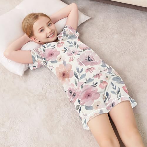 ALAZA Sweet Flower Watercolor Leaves Pajamas Satin Pajama Set Short Sleeve Button Down Sleepwear 1