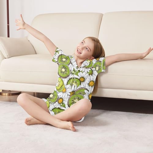 ALAZA Kiwi Fruit Daisy Flower Pajamas Satin Pajama Set Short Sleeve Button Down Sleepwear 1
