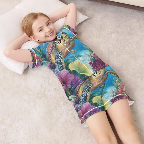 ALAZA Sea Turtle Flower Blossom Satin Pajamas Set Short Sleeve Button Down Sleepwear Summer Pjs 2 Piece 1
