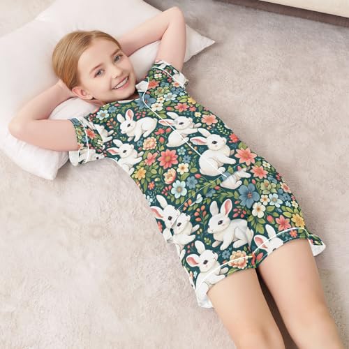 ALAZA Cute White Rabbit Floral Pajamas Satin Pajama Set Short Sleeve Button Down Sleepwear 7