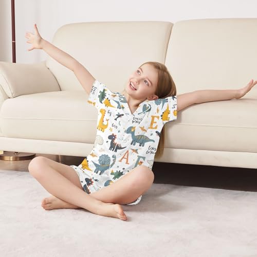 ALAZA Dinosaur Alphabet White Pajamas Satin Pajama Set Short Sleeve Button Down Sleepwear 3