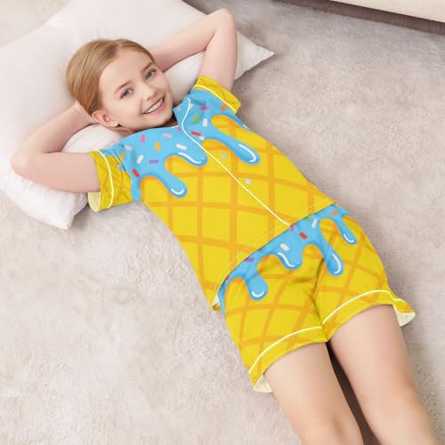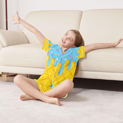 ALAZA Yellow Blue Ice Cream Satin Pajamas Set Short Sleeve Button Down Sleepwear Summer Pjs 2 Piece 1