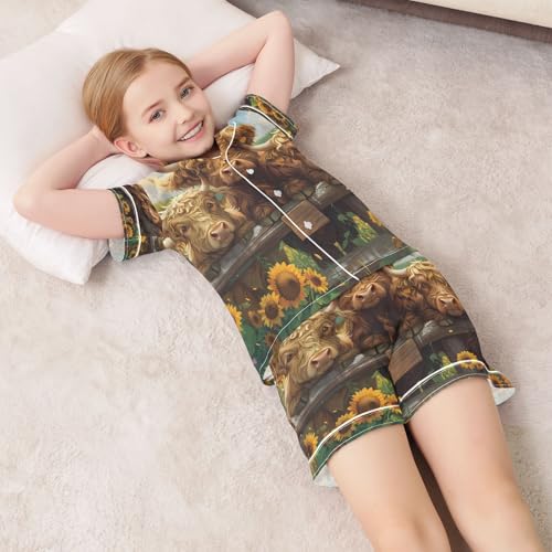 ALAZA Sunflower Highland Cattle Blossom Satin Pajamas Set Short Sleeve Button Down Sleepwear Summer Pjs 2 Piece 1