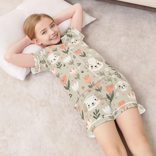 ALAZA Puppy Dog Tulip Flower Pajamas Satin Pajama Set Short Sleeve Button Down Sleepwear 2