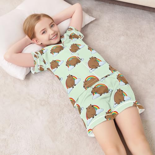 HOT ! senya Capybara with Rainbow P Satin Summer Pajama Sets Silk Short Sleeve Button Down Sleepwear