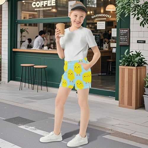 Girls Cute Yellow Chick Blue Print Shorts Kids Summer Pajamas Comfy Athletic Activewear for Teens Youth, X-Small 4